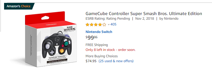 Those of you familiar with the competitive Smash scene know that the first-party Gamecube controller is the absolute favorite of the community. I think there’s a legitimate argument that the Gamecube controller may be the best controller of all time, and I happen to buy that argument. Nintendo recognizes this, and has bent over backwards to make first-party controllers available to the newest generation of Smashers in both Smash 4 and Ultimate. The new controllers were inexpensive and plentiful… for about a week. These days, you’ll come up with these results when you search for a first-party Gamecube controller:
