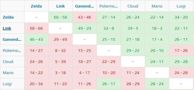 Even just glancing at this chart, you can already see what kind of value this information would have. If you’re in a set against a Mario and you have the option to counterpick, should you put in a Cloud, or a Link? Cloud has a 68% win rate against Mario, but Link has an 85% win rate. You should opt for the Link.