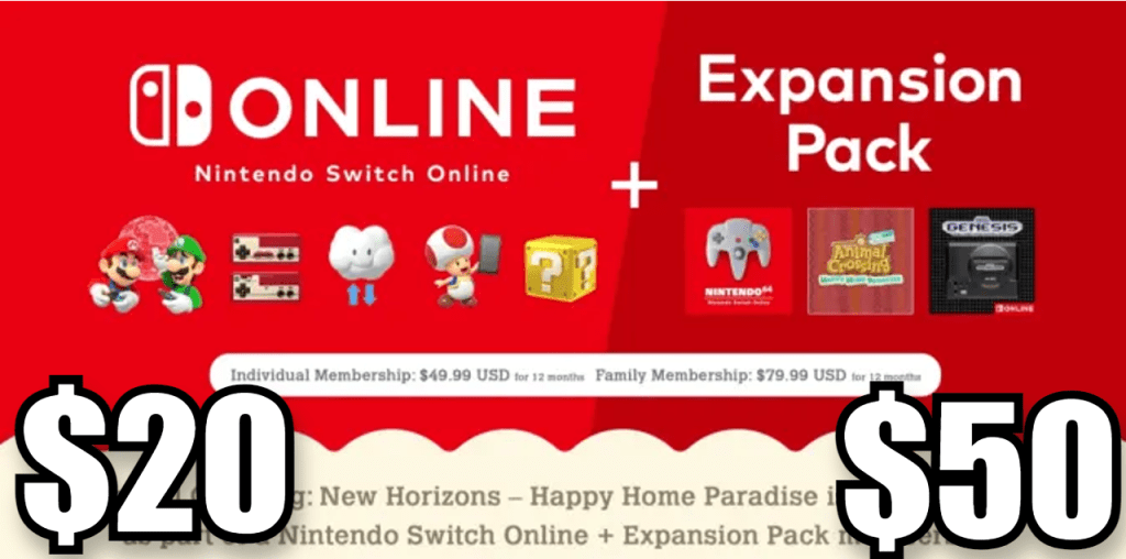 During the recent Animal Crossing Direct, Ninty announced that they would be rolling out a second package for Nintendo Switch Online at a higher price. This package would add Nintendo 64 and Sega Genesis games to the Nintendo Switch library, allow access to the Happy Home Paradise DLC package for Animal Crossing: New Horizons, and… I’m pretty sure that’s it. This extra setup will run you $50/year, called the “Expansion Pack”.