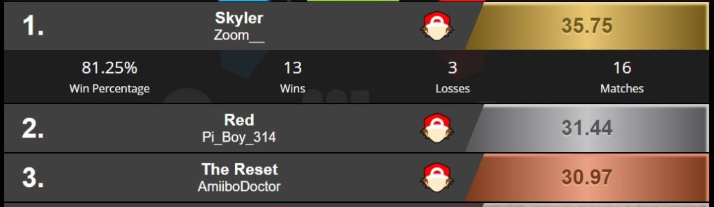That’s quite the leapfrog over the second best PT, and I couldn’t be happier about it. Pokemon Trainer is one of my favorite amiibo, and if there’s one thing I love to see in the amiibo meta it’s watching people improve on it over time. That’s what it’s all about! So congratulations to Zoom for taking up the mantle of Pokemon Trainer Trainer, and I can’t wait to catch some replays of Skyler.