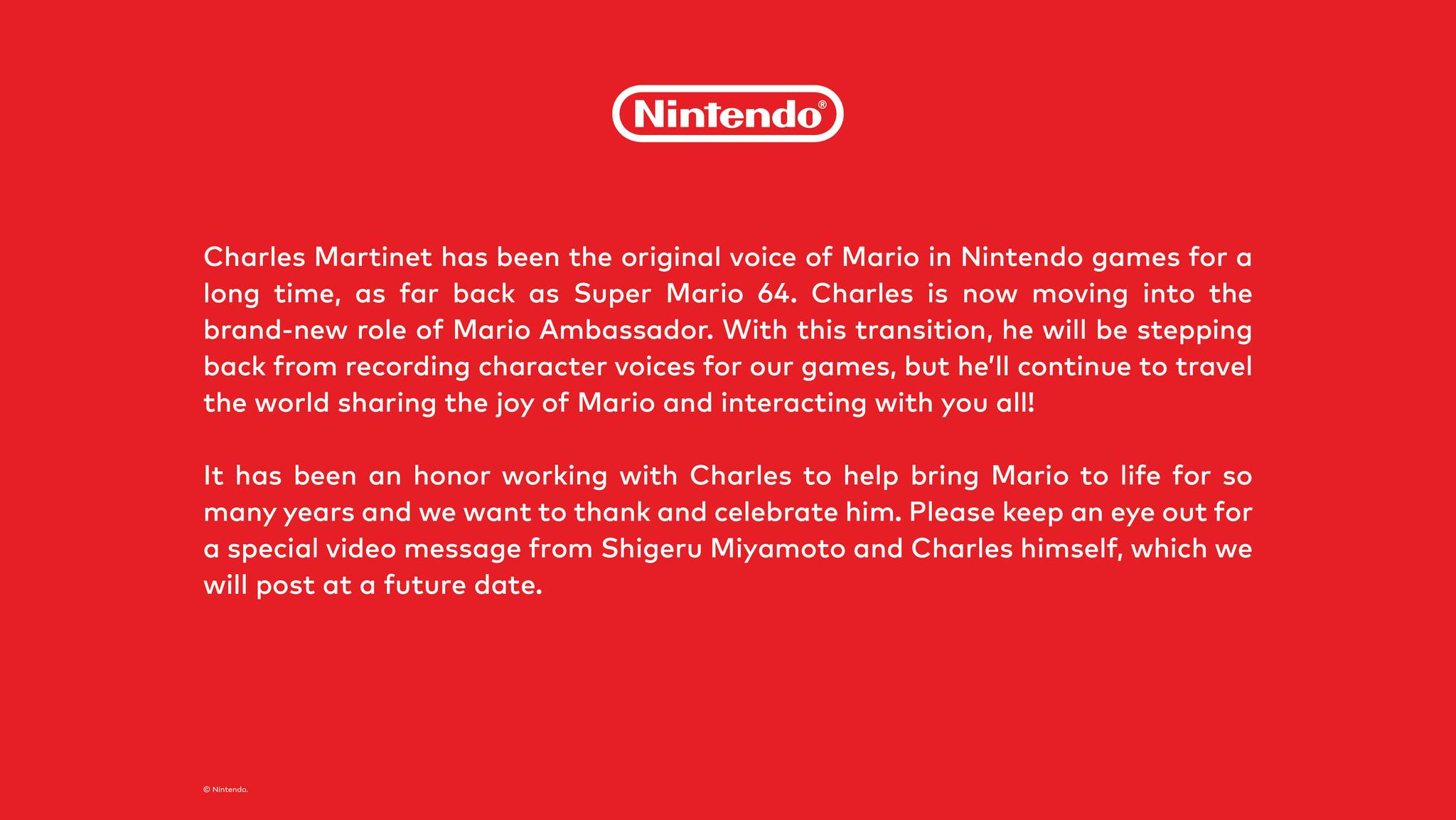 Charles Martinet has been the voice of Mario since Mario had a voice – somewhere in my basement I have Nintendo Power VHSes of Spaceworld 2001 where Charles Martinet makes his first appearance voicing Mario. But, as of this morning, Nintendo has announced he’s becoming a “Mario Ambassador”.