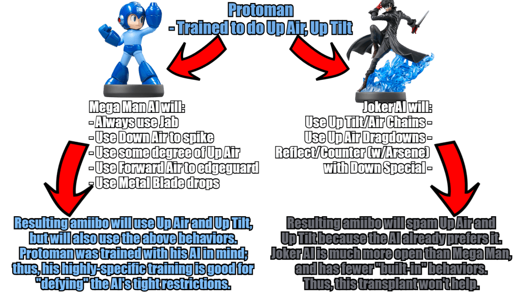 Joker, however, is programmed a different way. Joker’s AI is also heavily weighted, but unlike Mega Man, he’s weighted in favor of using Up Air and Up Tilt, and not the rest of his moveset. The Protoman-Joker transplant would produce a Joker who relies on Up Air and Up Tilt significantly more than Protoman-Mega Man ever did, as a result of Joker’s AI being weighted differently.