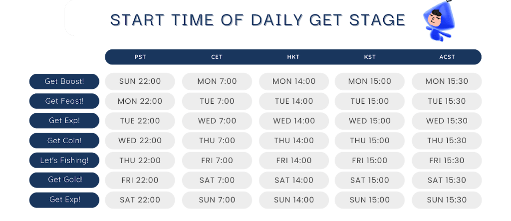 - Let’s Fishing! – Timed fishing event. Bait not provided. Useful for increasing fishing points when at a low fishing level, but not as effective as joining Denpa Men community servers and adding a guy with a great island as a friend.