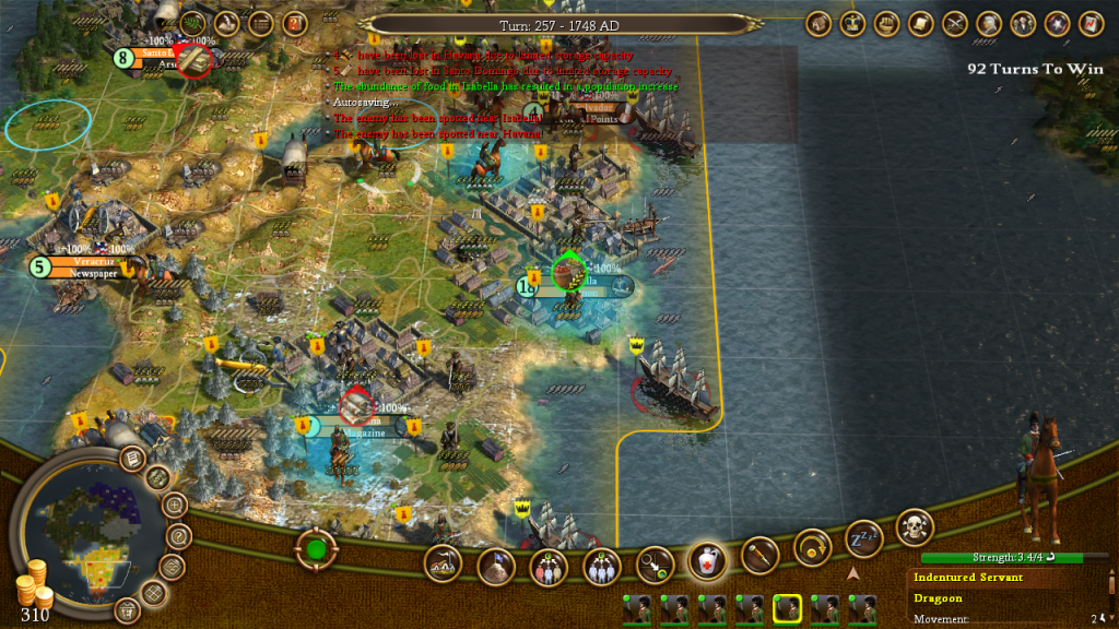 At this point winning the game simply comes down to battle tactics and surviving to the next wave. The King will usually make landfall within a few tiles of the first colony you placed down, and will blanket the coast. Use your Dragoons to kill their Cannons. Keep most of your Soldiers fortified on the coastline and park a few in the colonies to defend them*, occasionally poking their heads out to pick off units they have an advantage against. Use the Cannons you bought a few hundred years ago to re-capture any cities that are taken. Do not bother with ocean battles – the king’s navy outclasses yours by so much that I’m not even sure it’s possible to win the ocean game in a vanilla game of Colonization on a game with real difficulty.