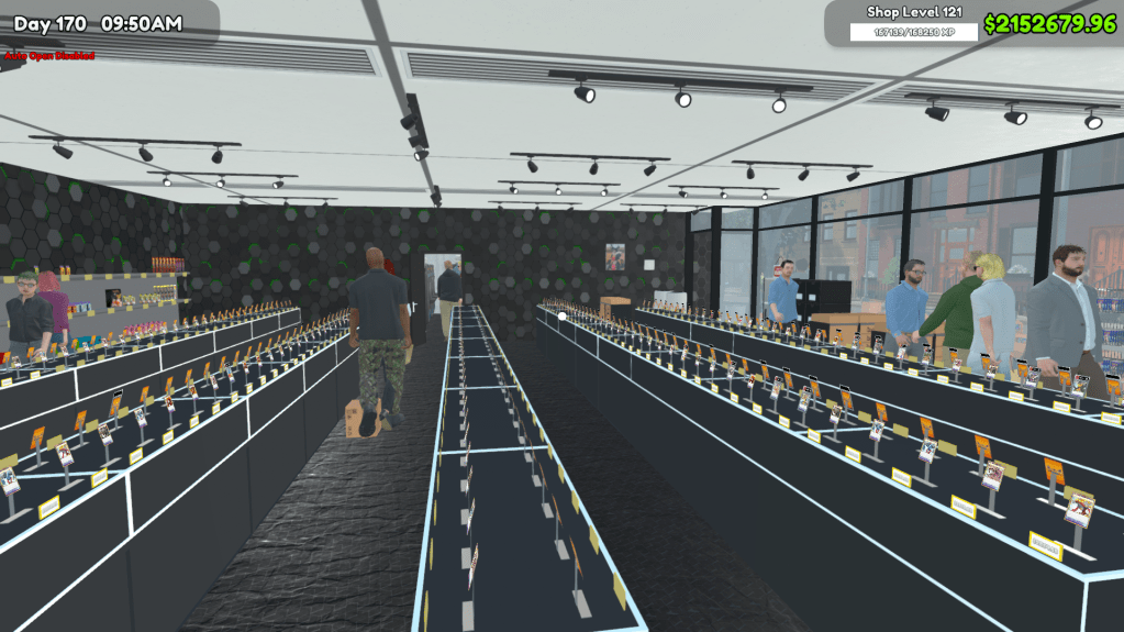 The big “hustle” in the beginning is just processing customers, stocking all the booster packs and boxes you can, and keeping the checkout lines short. Don’t spend money on physical store expansions until you’re at least level 15, and when you do buy expansions, buy as many as you can at a given time (more on that later). Same thing with employees: employees turn the game from a micromanaging simulator to a more AFK experience, which changes the pace of the game quite a bit, as it becomes less of a hustle simulator and more of a strategy simulator, so wait until you’re doing about a thousand bucks a day of revenue before hiring one. I encourage putting your first guy on the checkout counter so you’re free to restock as needed, handle trade requests and restock singles if you’ve got the table for it.