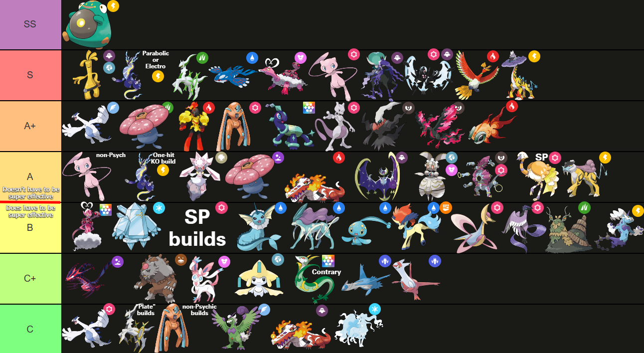 Mew is a Pokémon that has a theoretically infinite number of builds, or might as well have that many. For purposes of this tier list, we will simply split them into Psychic type Mew and non-Psychic type Mew, as that is much simpler. Just know that he’s got a lotta options I’m not giving you here.