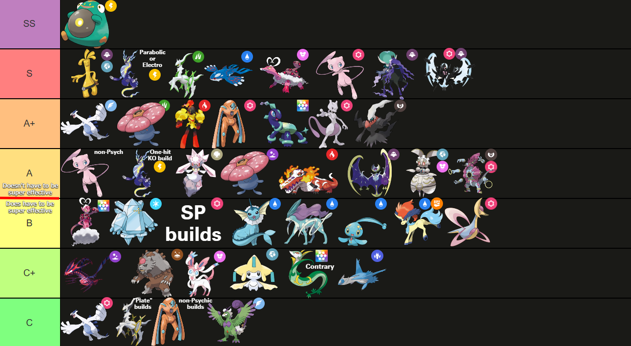 Mew is a Pokémon that has a theoretically infinite number of builds, or might as well have that many. For purposes of this tier list, we will simply split them into Psychic type Mew and non-Psychic type Mew, as that is much simpler. Just know that he’s got a lotta options I’m not giving you here.