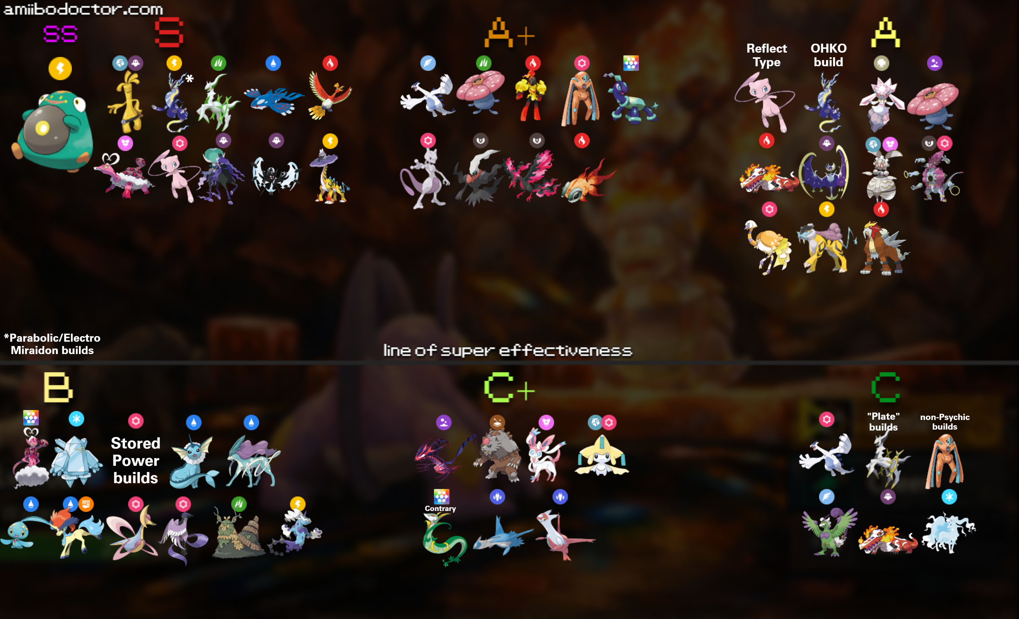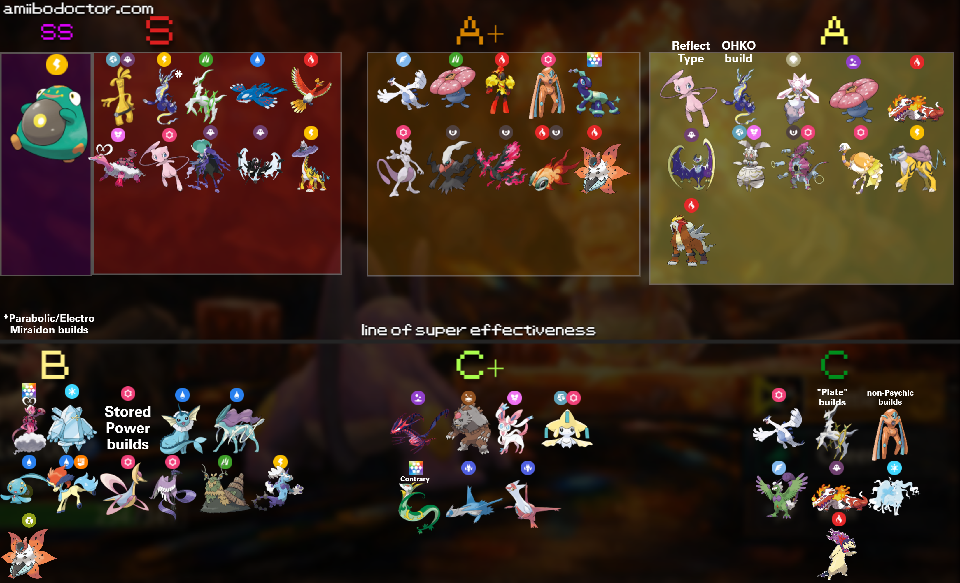 Mew is a Pokémon that has a theoretically infinite number of builds, or might as well have that many. For purposes of this tier list, we will simply split them into Psychic type Mew and non-Psychic type Mew, as that is much simpler. Just know that he’s got a lotta options I’m not giving you here. (But I do go into detail about them here).