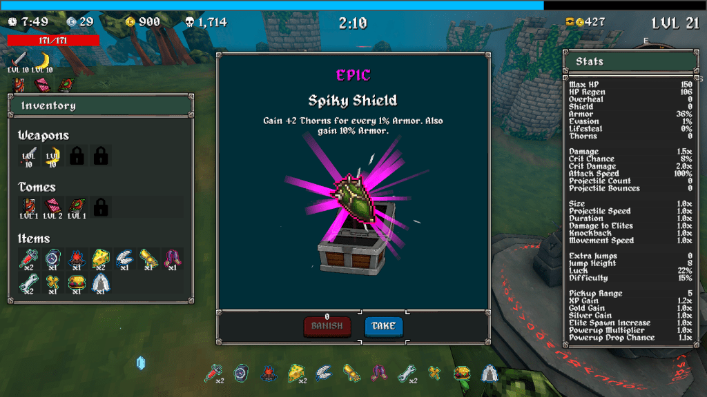 The specifics of what you need for each run isn’t something I can prescribe for you, because each run is randomly generated and you don’t know what you have until you roll the dice. Just know that upon level ups (the blue shards are your XP by the way, and the blue bar at the top is your level gauge) you’ll get to choose an upgrade, and the wooden chests and jars along the way are also sources of upgrades. The chests are, because this is a roguelike, loot box-type RNG pulls. You can’t decide what to get, but nothing seems to hurt you.