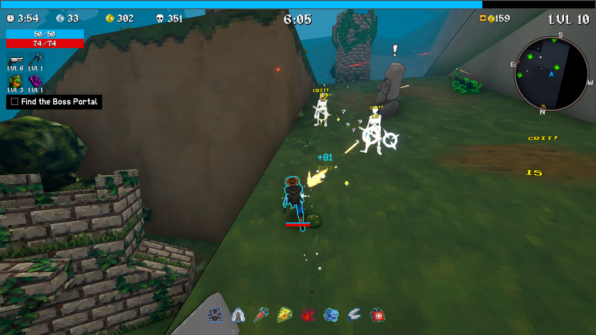 Revolver – 5 base damage, 6 base projectile count, upgrades damage, crit chance, crit damage, projectile bounces, projectile count, and projectile speed. Starts with 6 projectiles, which makes projectile count upgrades extremely efficient. Bounces plus high projectile count means each attack hits many enemies multiple times. Crit stats enable burst damage. Excellent weapon for projectile-focused builds, and allows you to keep a distance from bosses while doing great damage.
