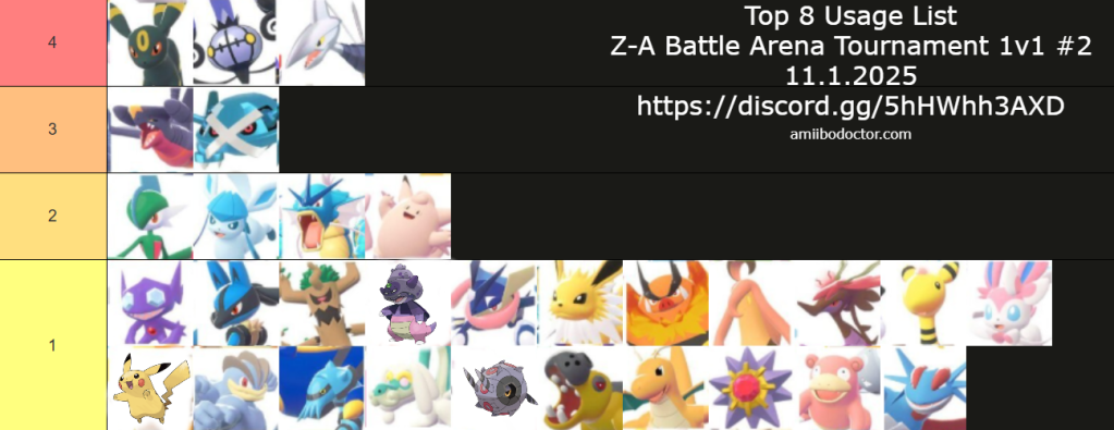 In my last post regarding the second Legends Z-A 1v1 tournament, we examined the overall usage of all the Pokémon between the 18 trainers that participated (this one). There were a few surprises, chief among them being the prominence of Chandelure, but nothing that stood out too much… Yet. I took the liberty of going to the bracket itself and making my own usage list from the top eight trainer placements instead of everyone’s placement, and what I got was a relatively unusual data set compared to what you would expect given the current state of the meta. Here is my data released below: