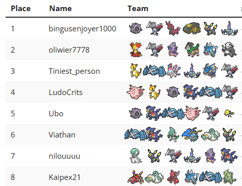 Overall, this is the first tournament to not see so much extreme change from week to week – there’s a few small surprises in here, like that Bellsprout that made me laugh when I saw it but actually did see some proper use, but by and large most of what you’ll see in this team sheet is a return customer. Here’s the overall top 8 teams, and here’s the link to the brackets.
